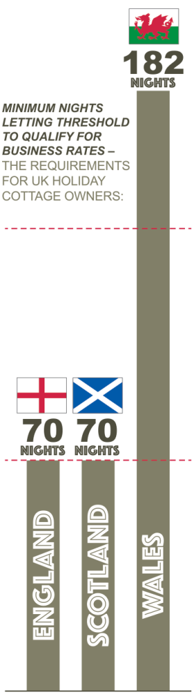 In England and Scotland, holiday cottages still qualify for business rates if they are let for just 70 nights a year. In Wales, the threshold has been raised to